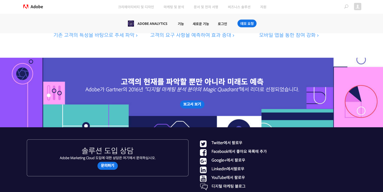 반면 서비스에 대한 자세한 설명이 필요하고 단순히 하나의 카피 문구만으로는 도입을 결정하기 어려운 아래 어도비 애널리틱스의 경우에는 최하단에 ‘문의하기’ 버튼을 두었다.