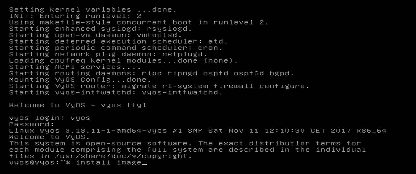 초기 ID와 비밀번호는 vyos이다.