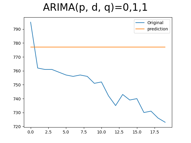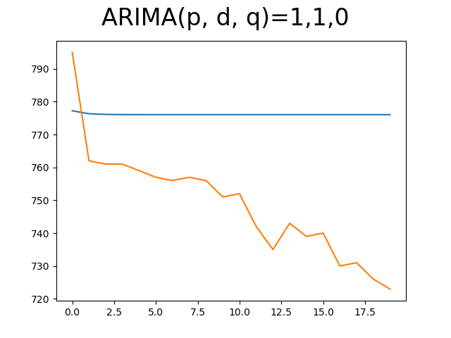 이제 python으로 구현해보자. ARIMA로 다른 모델을 모두 생성할 수 있기 때문에 이번엔 ARIMA만 이용해서 구현해보도록 한다. 한 번은 차분을 적용하지 않고, 한 번은 1차 차분을 적용해 모델을 구성해보았다. 지금은 input 데이터 개수는 120개 예측할 step은 20으로 고정하고 lag은 default로 None을 넣고 실험을 진행하였다. raw data 생성 주기는 5분이다.