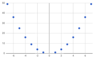 피어슨 상관계수는 선형 관계일 때만 유의미하고, 2차식에서는 의미가 없다. 따라서 아래 2차식의 피어슨 상관계수는 0이다. 하지만 r=0일 때는 상관관계가 없다고 보는 것이지 아래 2차 식이 실제로 상관관계가 없는 것을 의미하지는 않는다. 따라서 피어슨 상관계수는 선형 관계일 때만 사용할 수 있다.