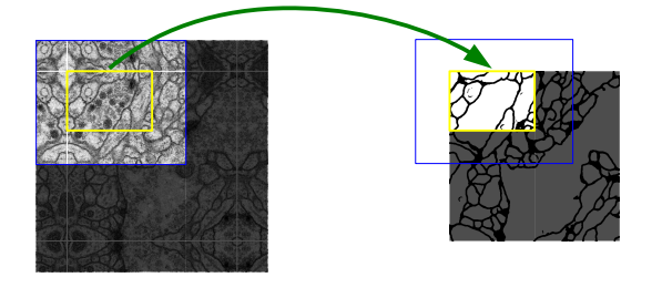Overlap-tile strategy for seamless segmentation of arbitrary large images (here segmentation of neuronal structures in EM stacks). Prediction of the segmentation in the yellow area, requires image data within the blue area as input. Missing input data is extrapolated by mirroring