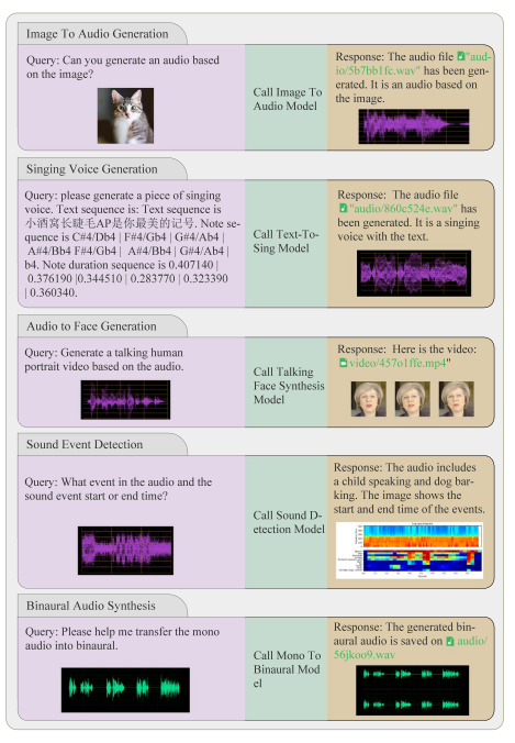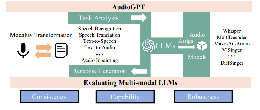 AudioGPT는 GPT-4와 같은 대규모 언어 모델(LLM)의 능력을 활용하여, 오디오 데이터를 처리할 수 있도록 설계되었다. 복잡한 오디오 작업을 처리하기 위해 ChatGPT에 오디오 기반 모델을 갖추고 있으며, 음성 대화가 가능하도록 모달리티 변환 인터페이스와 연결되어 있다. Consistency, Capability, Robustness 측면에서 멀티모달 LLM을 평가하기 위한 원칙을 설계한다.