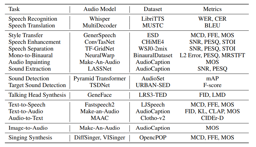 복잡한 오디오 정보를 처리하는 작업 수행자로서, 오디오 기반 모델은 복잡한 다운스트림 작업을 처리하는 데 중요한 영향을 미친다. 이 논문에선 음성, 음악, 소리 및 가상 얼굴(Talking Head)의 이해 및 생성과 관련된 평가 지표(evaluation metrics)와 다운스트림 데이터셋을 다음 Table 3에서 확인할 수 있다.