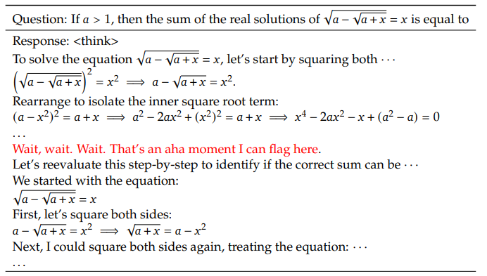 DeepSeek-R1-Zero의 훈련 과정에서 "Aha Moment"라는 흥미로운 현상이 관찰되었다. 이는 모델이 자신의 초기 접근 방식을 재평가하고, 문제 해결을 위해 더 많은 사고 시간을 할당하는 단계에서 발생한다. 이 현상은 모델의 추론 능력이 향상되고 있음을 보여주며, 강화 학습이 예상치 못한 정교한 결과를 도출할 수 있음을 시사한다.