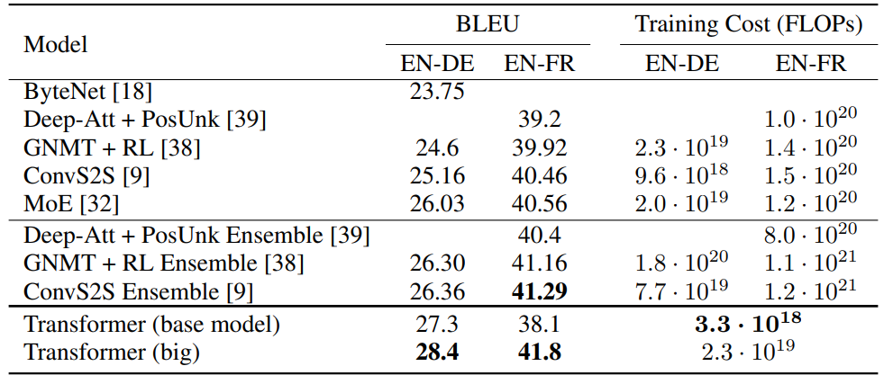 Transformer는 WMT 2014 영어-독어, 영어-프랑스어 번역 데이터셋에서 SOTA를 달성하였으며, 특히 학습 속도 측면에서 기존 모델 대비 훨씬 빠르게 수렴하였다.