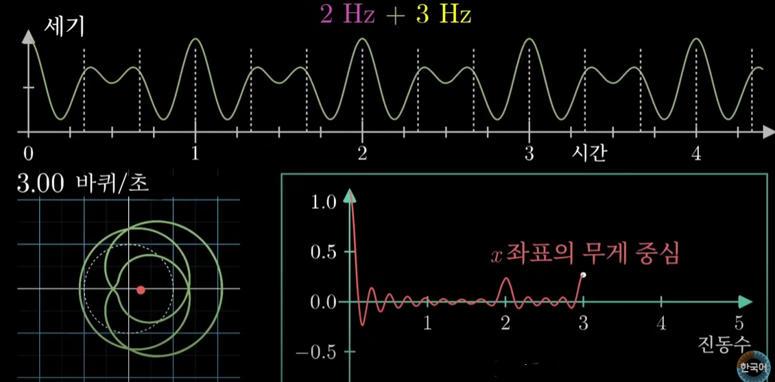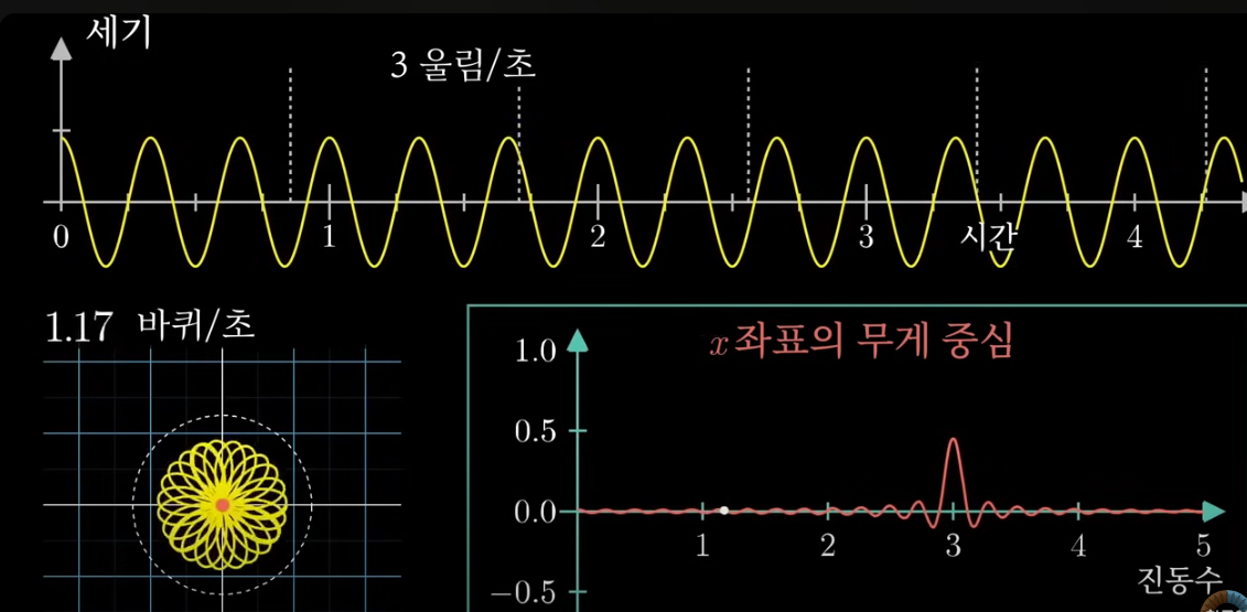 하지만 초당 3바퀴를 이 원에 감게 되어 진동수(3Hz)와 일치하게 되면 무게 중심은 한쪽으로 치우치게 되며 오른쪽 하단 'x 좌표의 무게 중심' 그래프에서 확인할 수 있듯 3에서 무게 중심이 원점을 크게 벗어나게 된다. 이를 Spike라고 한다. 0에서 Spike가 존재하는 이유는 해당 설명에서 주기 파형이 0 이상인 양수 범위이기 때문이다.