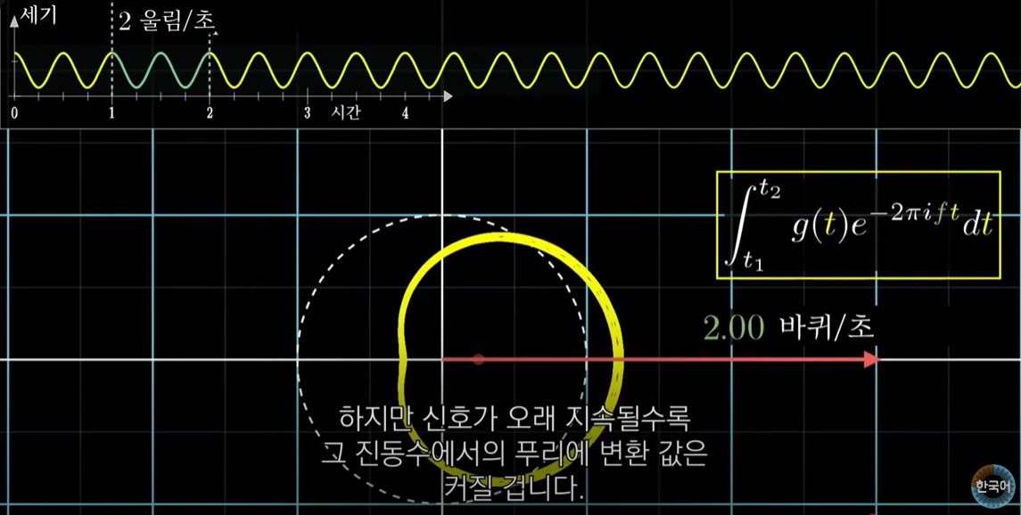 여기까지 설명한 것이 푸리에 변환에 대한 기본적인 아이디어이다. 내가 참고한 영상에선 이를 '거의 푸리에 변환'이라 칭한다. 아직 푸리에 변환에 사용되는 좀 더 복잡한 내용들에 대한 설명은 포함되어있지 않기 때문이다.