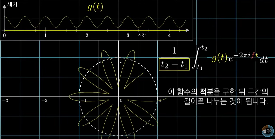 여기서 \( g(t) \)는 주파수 신호가 되고 이를 위에서 말한 오일러 방정식에 곱하게 되면 원을 감으며 \( g(t) \)의 크기에 대응하는 시점에 같은 크기를 가지는 그래프가 그려질 것이다. 이를 이용해 감긴 그래프의 무게 중심 위치를 추적만 할 수 있다면 어떤 주파수가 섞여있는지 찾을 수 있다.