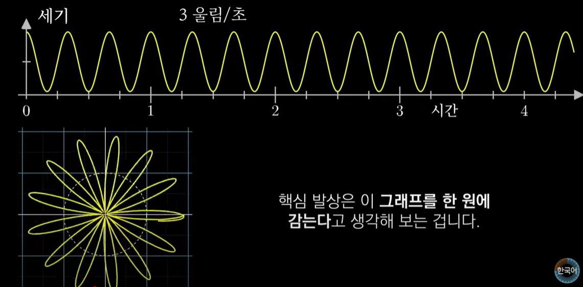 위 그림에서 상단 그래프는 3Hz의 신호이다. 그림에 나와있듯 이 상단 그래프를 좌측 하단의 복소 평면에 나타나고 있는 원에 감는 것이다. 위 그림에선 초당 약 0.25바퀴를 감고 있는 것으로 볼 수 있다. 이 '감는 진동수'를 조절하면 '감긴 그래프'가 어떻게 생길지 결정된다. 매 시점 원에서 나타나는 벡터의 크기는 해당 시점의 3Hz 신호의 크기와 동일하다.