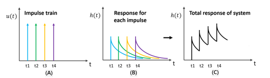 시간의 흐름에 따라 지속적으로 시스템에 임펄스 입력이 들어오는 상황을 Impulse Train이라 하며, 다음 Fig 4의 (A)와 같이 \( t = 0,1,2,3 \)의 일정 시간마다 임펄스 입력이 있다고 가정하자. 각 입력에 대한 시스템 응답은 (B)와 같이 나타나게 되며 LTI 시스템을 이용한다면 이 각각의 영향들은 모두 중첩(Superposition)되어 (C)와 유사한 형태로 전체 시스템 응답을 도출하게 된다. 이 전체 시스템의 응답을 계산하는 방법이 Convolution이다.