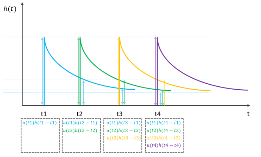 시간의 흐름에 따라 지속적으로 시스템에 임펄스 입력이 들어오는 상황을 Impulse Train이라 하며, 다음 Fig 4의 (A)와 같이 \( t = 0,1,2,3 \)의 일정 시간마다 임펄스 입력이 있다고 가정하자. 각 입력에 대한 시스템 응답은 (B)와 같이 나타나게 되며 LTI 시스템을 이용한다면 이 각각의 영향들은 모두 중첩(Superposition)되어 (C)와 유사한 형태로 전체 시스템 응답을 도출하게 된다. 이 전체 시스템의 응답을 계산하는 방법이 Convolution이다.