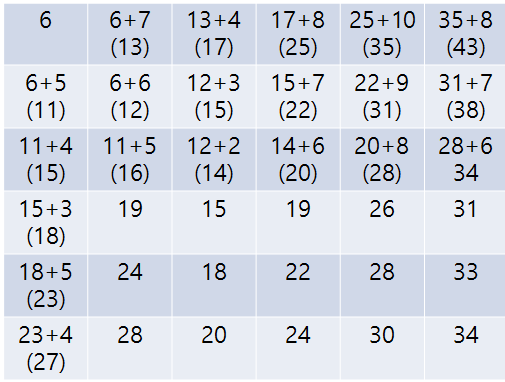 (5, 5)의 34가 DTW distance가 되고 (4, 5), (4, 4), (5, 4)에 최솟값들을 표시하며 0번째 행으로 진행한다. 이때 만약 (4, 5)가 28이라면 B의 4번째 요소가 A의 4, 5번째 요소에 매칭 되게 된다.