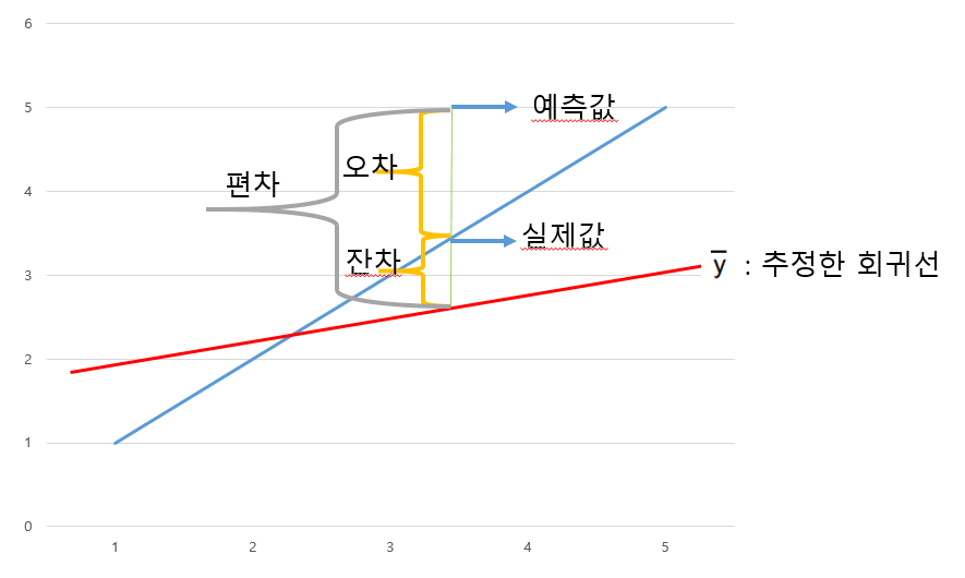 모든 데이터를 하나의 회귀식으로 설명하기는 힘들다. 또한 절대적인 회귀식을 도출하는 것도 쉽지 않다. 일반적으로 표본이란 것 자체가 대표성을 갖긴 하지만 모집단 그 자체가 될 순 없기 때문이다. 그러므로 관측값과 기댓값의 차이를 어느 정도 인정하고 진리에 가까울 것으로 추정되는 회귀식을 도출한다. 이때 차이를 의미하는 단어들이 있다.