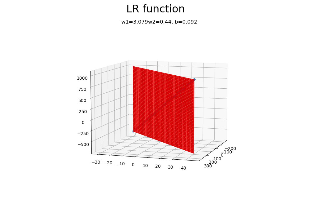 아래는 직접 구현해본 다중 선형 회귀 python 소스 코드이다. 만약 지금의 방정식을 2차원 평면 위에 표시하면 당연히 이상하게 나올 것이다. 따라서 굳이 3차원에서 표현해보았다.