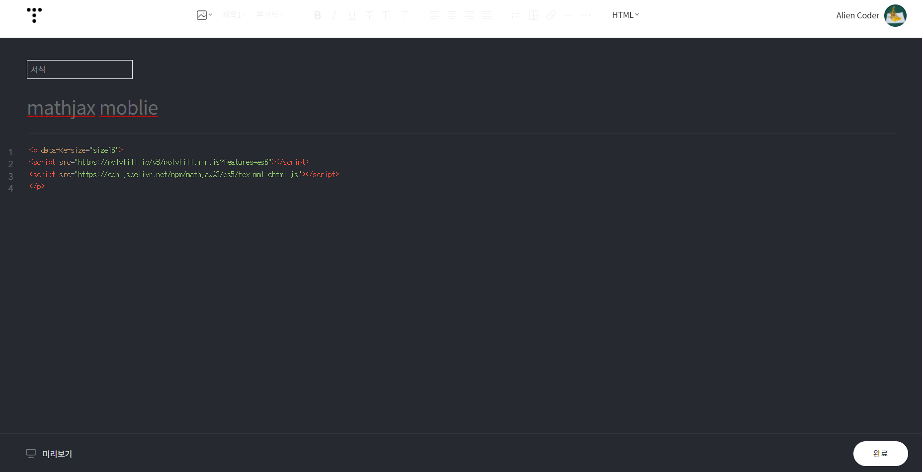 아래 순서대로 수행하면 /m/이 붙은 모바일 웹에서도 수학기호 문법이 깨지지 않는다. 하지만 이 방법은 일괄 적용이 되는 부분이 아니라서 글을 작성할 때마다 서식을 추가해주어야 한다.