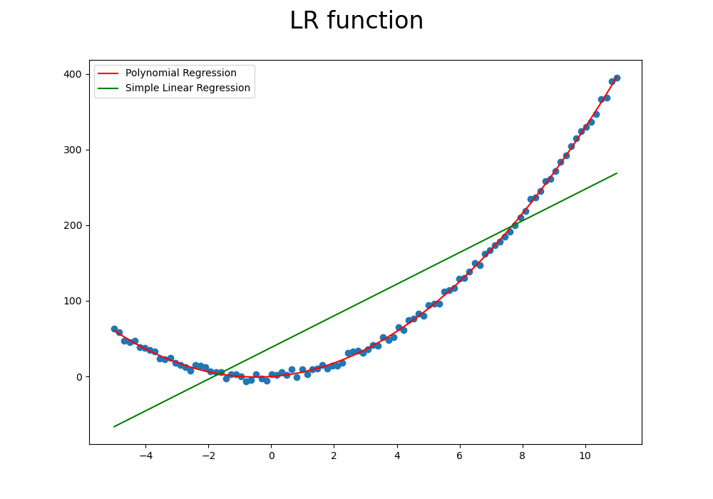 주어진 데이터를 다항 회귀와 단순 선형 회귀를 이용해 각각 표현해보면 아래와 같다.