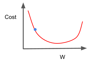 다음은 비용(cost) 함수이다. 이는 w, b의 값을 찾기 위한 함수이다. 일반적으로 경사 하강법(Gradient Descent)을 사용하기에 적합한 함수 모양으로 만들어야 한다. 일반적인 Regression의 비용 함수는 \( \sum(예측값-실제값)^2 \)으로 계산하는 최소 제곱합(MSE)과 같이 2차 함수의 형태로 만들어 경사 하강법을 적용한다.