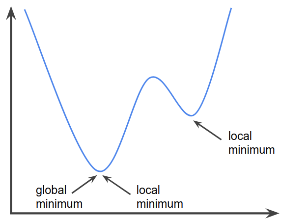 여기서 \( \hat{y} \)는 예측값 \( y \)는 원본 데이터 값이다. 하지만 로지스틱 회귀의 비용(손실) 함수는 달라야 한다. 자연상수 e에 의해 MSE는 2차 함수의 일반적인 모양을 띄지 않아 지역 최소(local minimum) 문제를 야기하기 때문이다. 이는 실제 최소 지점이 아님에도 다른 골짜기 부분을 최소 지점이라 생각하는 문제이다. 이를 상쇄하기 위해 log를 씌워주는 과정이 추가된다.