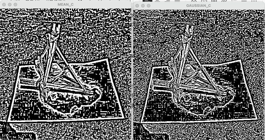 - cv2.ADAPTIVE_THRESH_GAUSSIAN_C = 적용할 픽셀을 중심으로 하는 영역 안에 있는 Gaussian 윈도우 기반 가중치들의 합에서 보정값인 C를 뺀 값을 임계값으로 설정