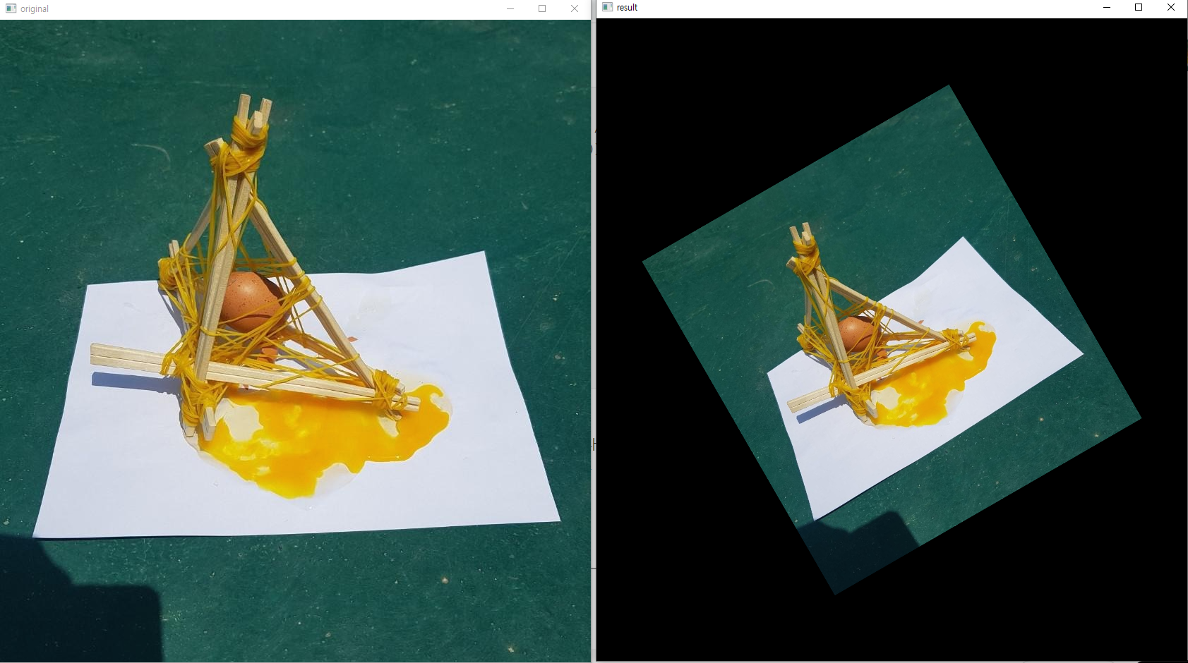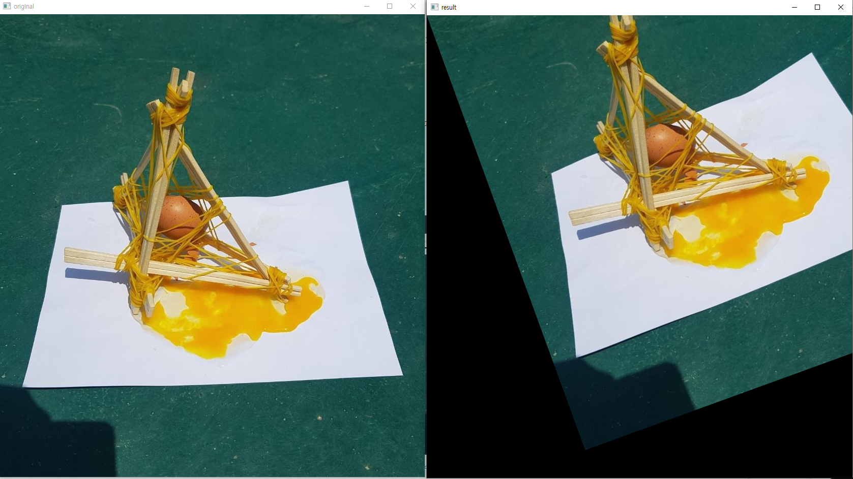 좌측 상단을 기준으로 이미지를 회전하였지만 출력 영상의 크기를 입력 영상의 크기와 동일하므로 이미지가 잘리는 부분이 생겨 원본이 훼손되는 것을 볼 수 있다.