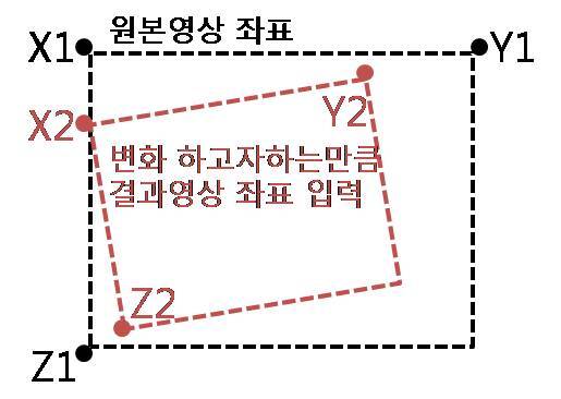 - 이미지의 끝 점 4개의 이전위치와 변환 후의 위치를 알면 이동 관계를 알 수 있음