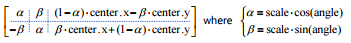 $$ \begin{bmatrix}x'\\y'\end{bmatrix}= \begin{bmatrix}cos\theta & sin\theta & \alpha\\-sin\theta & cos\theta & \beta \end{bmatrix} \begin{bmatrix}x\\y\\1\end{bmatrix} = \begin{bmatrix} a & b & c \\d & e & f \end{bmatrix} \begin{bmatrix}x\\y\\1\end{bmatrix}$$