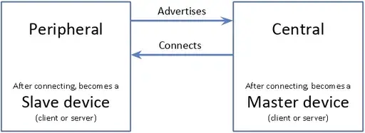BLE로 연결되기 위해 각 기기는 서로의 역할을 구분하게 되는데 Central은 scan과 게시 검색(looking for advertisement)을 담당하고, Peripheral은 게시(advertisement)를 만든다.