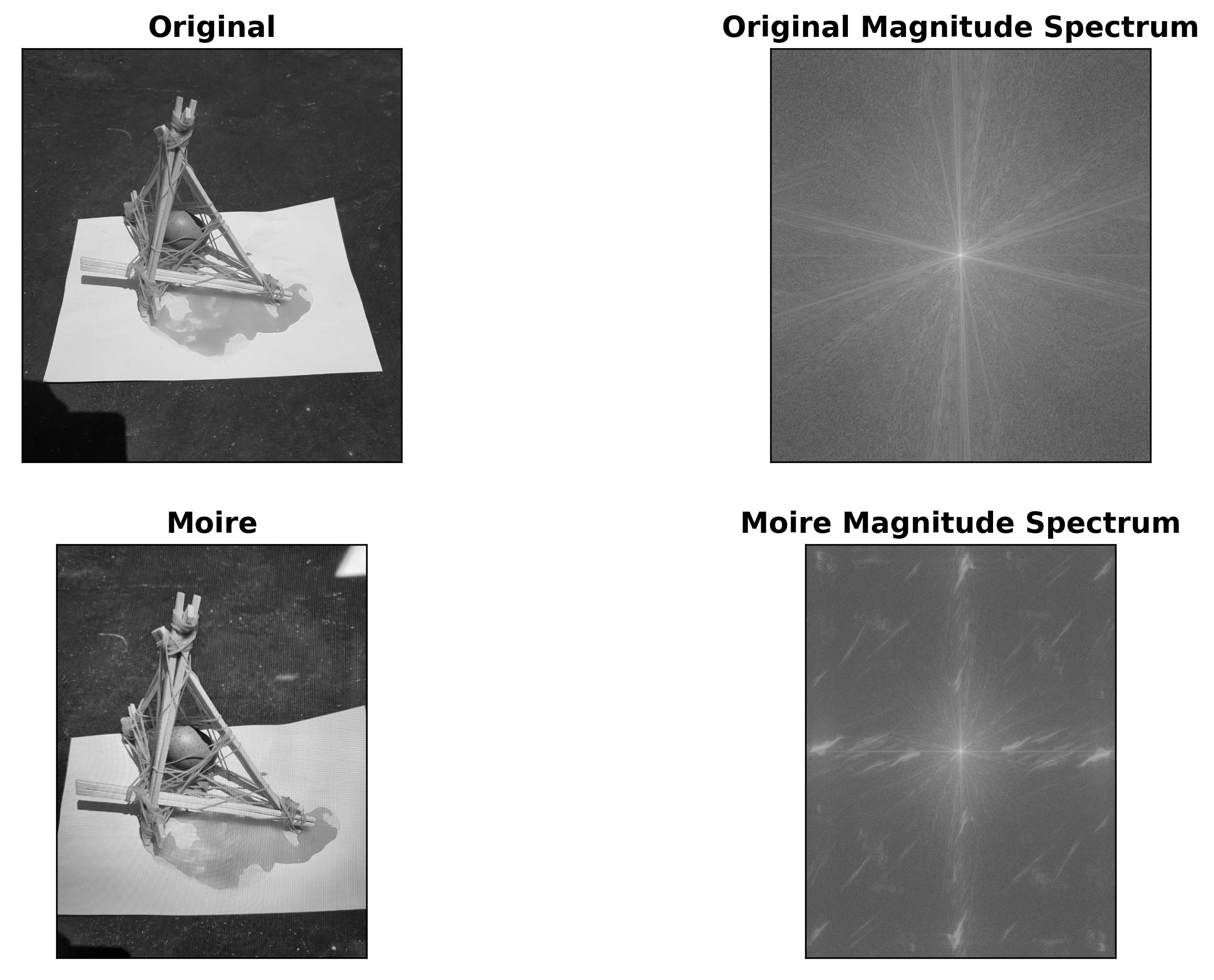 모아레 현상은 LPF(Low Pass Filter)를 이용해 어느정도 지울 수 있다. 퓨리에 변환(Fast Fourier Transform, FFT)을 이용해 사진이 가지고 있는 주파수를 파악하고 LPF를 이용해 특정 고주파 영역을 날려주면 된다. 영상 처리에서는 2차원 푸리에 변환을 사용한다. 이는 영상을 x축 또는 y축 방향으로 따라가면서 픽셀의 밝기 변화를 파형 또는 신호로 보고 주파수 분석을 적용한다. 푸리에 변환을 통해 얻은 각 주파수 성분의 강도를 스펙트럼(spectrum)이라고 부르는데 스펙트럼도 이미지처럼 표현이 가능하다.