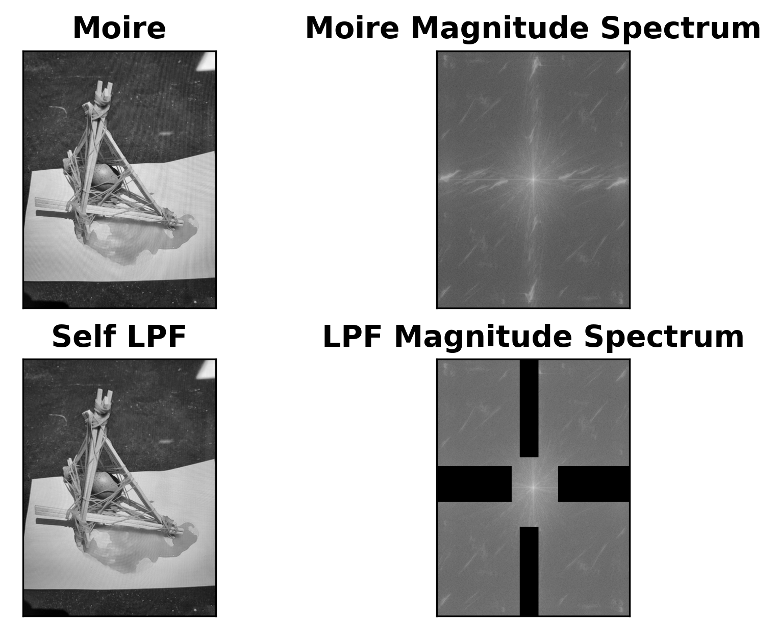 위 코드를 통해 아래의 퓨리에 변환을 통해 스펙트럼을 표현한 결과를 볼 수 있다. 원본 사진과 모아레 현상이 생긴 사진의 스펙트럼을 비교하면 확연하게 노이즈가 생겨있는 것을 볼 수 있다. 사진 사이즈는 따로 맞추지 않아 대략적인 스펙트럼만 주목하면 된다.