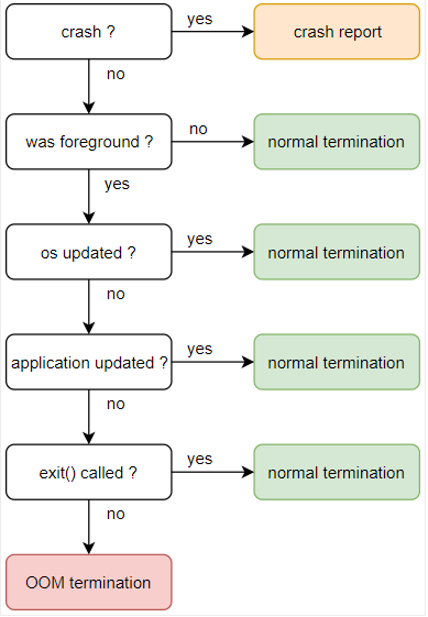 OOM에 의해 앱이 종료되는 경우, 앱 프로세스 내부에서 이벤트를 취득할 수 없으며, 앱 프로세스 외부에서 강제로 종료되기 때문에 정확하게 OOM을 검출할 수 없다. 또한, 앱이 표시된 상태에서 프로세스가 종료되는 것은 일반적으로 비정상 종료로서, 그 중에 OOM에 의한 종료도 포함된다. 따라서, 앱이 표시되는 동안 프로세스가 종료된 경우, 다음과 같은 절차에 따라 종료 원인을 판정하고, 다음에 실행될 때 OOM 발생을 알린다.