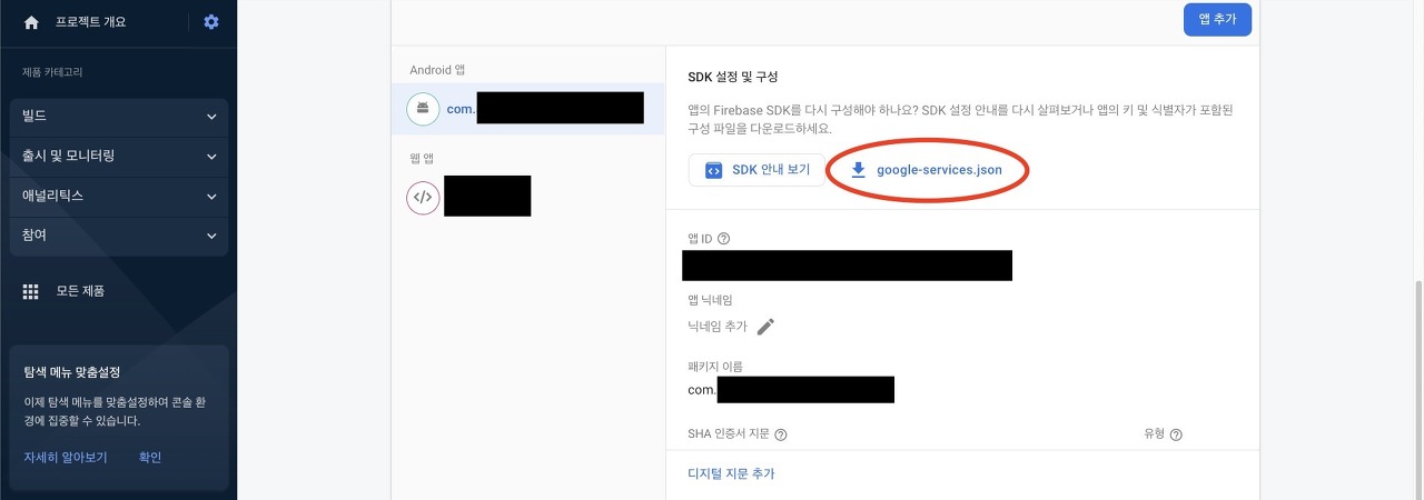 google-services.json 파일 버튼을 눌러 다운로드 한다.