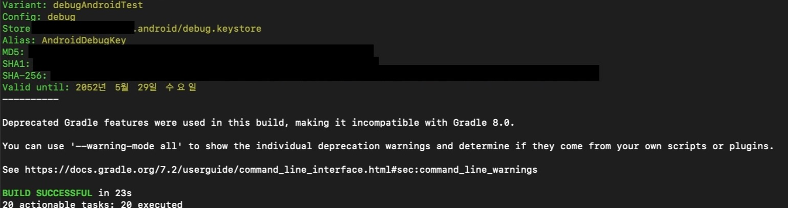 패키지 수만큼 프린트 찍히긴 하는데 어쨌든 실행 후 별다른 오류 없이 잘 수행되면 위 그림처럼 SHA1 키를 확인할 수 있다. 이 SHA1 값을 Firebase의 디지털 지문을 추가해주고 다시 google-services.json을 다운로드하여 기존 파일 위에 덮어쓰면 해결된다.
