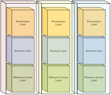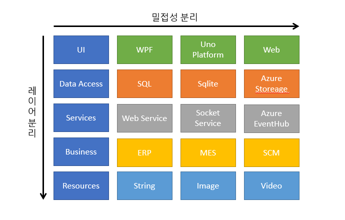 GUI 애플리케이션들이 공통적으로 분리하는 케이스는 Presentation, Business, Resource Access 레이어로 이뤄진 분리이다. 이런 카테고리 레이어들은 대부분의 애플리케이션이 필요한 주요 타입의 관심사를 포함하고 있고, 어플리케이션 내에 의존성 레벨을 최소화하는 관심사 구성에 해당한다.