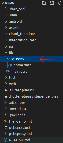 UI관련 파일을 저장하는 screens 폴더이다. 일반적으로 lib 아래에 위치시킨다. 사용자에 따라 pages로 이름을 쓰기도 한다. 화면의 UI들을 보관하는 폴더로, 특정 기능마다 화면 분류가 필요해 질 경우, 세부적으로 폴더들을 더 둘수 있다.