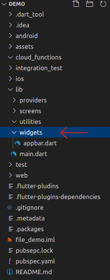 screens 폴더와 같은 레벨에 widgets 폴더를 생성해 이용할 수도 있다. 이 폴더 역시 일반적으로 lib 아래에 위치시킨다. widgets 폴더 또한 UI를 담당하는 위젯들을 모아두는 폴더인데, screens 폴더와는 차이가 있다. screens폴더가 화면 전반을 담당한다면, widgets은 그 화면의 부분부분의 요소들 중 재사용되는 UI들을 모아둔 곳이라고 보면 된다.