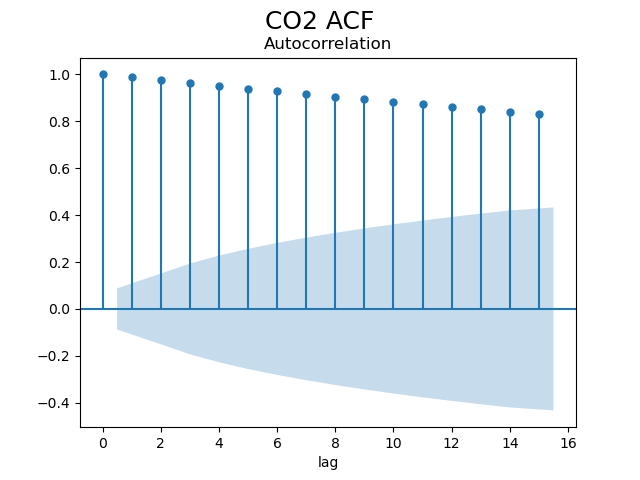 ACF는 k시간 단위로 구분된 시계열 관측치 간의 \( y_t \)와 \( y_{t+k} \)간 상관 관계를 측정하는 것이다. ACF의 반환값의 절대값이 커질수록 시차 시계열 데이터의 상관성이 크다고 할 수 있다. 이 크다는 것의 기준은 p-value와 같이 95% 근사 신뢰구간으로 정할 수 있다. 또는 \( \pm 1.96 * {SE_k \over \sqrt{n}} \)를 신뢰구간으로 적용할 수 있는데 이때, \( SE_k = \sqrt{1+2\Sigma^{k}_{j=1} \vert{\hat{\gamma^{2}_j}}}\vert \)이다.