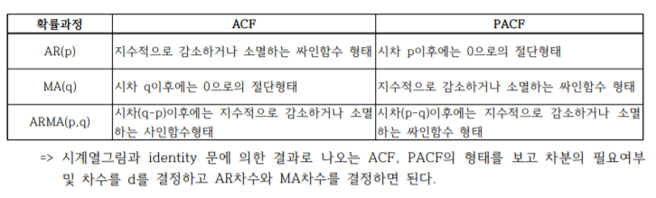 PACF가 시차 n에서 떨어지는 경우 AR(n)을 사용하고 하락이 점진적이라면 MA를 사용한다.