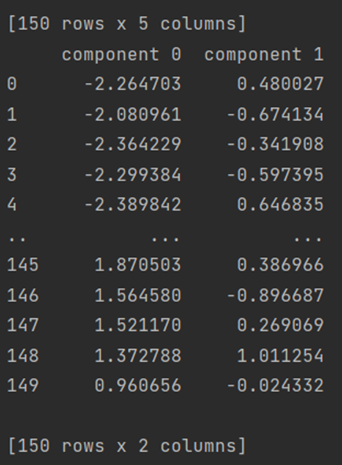 4가지 feature가 평균 0, 표준 편차 1을 기준으로 정규화된 결과를 볼 수 있다. 다음으로 이 정규화된 데이터를 2개의 주성분으로 차원 축소한다. 다만, target class 정보가 feature에 포함되지 않도록 주의해야 한다. 또한 원본 데이터에 대해 이 축소된 결과의 설명력을 알 수 있다.