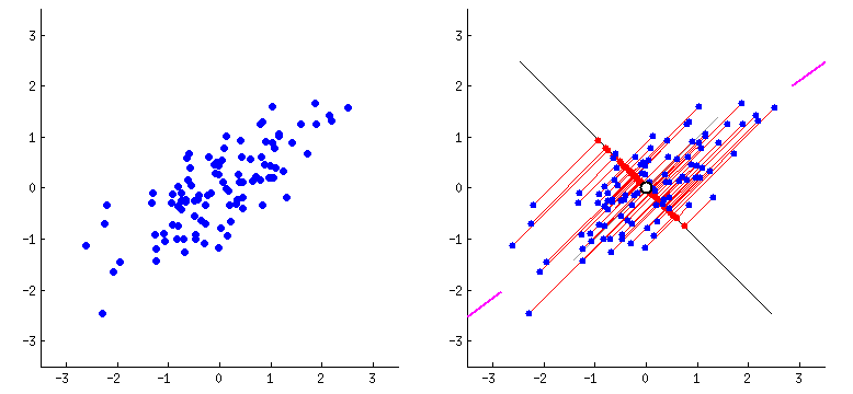 위에서 언급하였 듯 PCA는 데이터 하나하나에 대한 성분을 분석하는 것이 아니라, 여러 데이터들이 모여 하나의 분포를 이룰 때 이 분포의 주 성분을 분석해 주는 방법이다. 여기서 주성분이라 함은 그 방향으로 데이터들의 분산이 가장 큰 방향벡터를 의미한다.