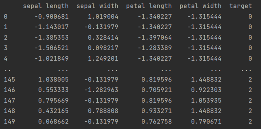 아래는 실제 데이터를 이용한 실습이다. 우선 데이터를 load한 후 정규화를 진행한다. 단, target 정보(꽃 종류)는 정규화를 진행하지 않았다.